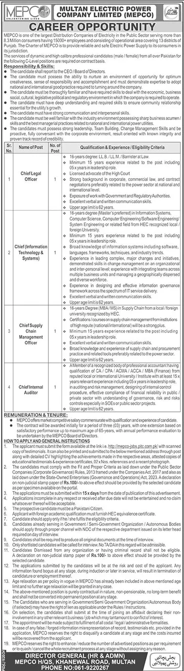 MEPCO Jobs Vacancies in Multan: Chief Positions Announced for 2025