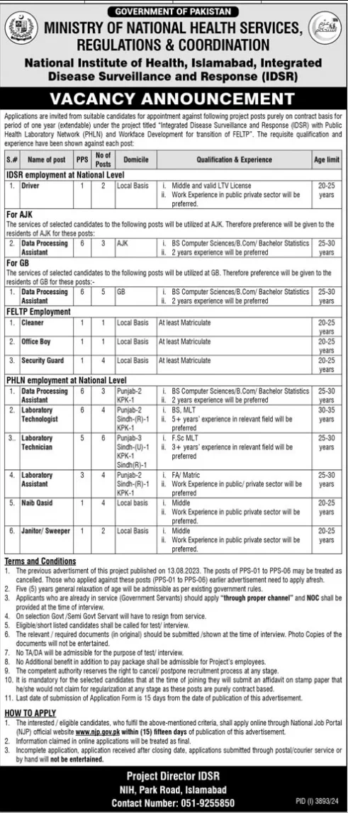 Latest Sweeper, Naib Qasid, Driver, Cleaner Jobs 2025 – Apply Now for Positions in Ministry of National Health Services