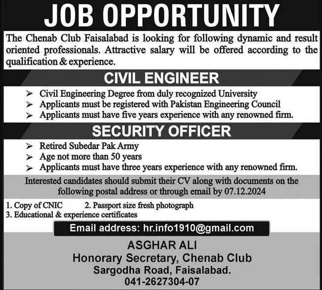 The Chenab Club is hiring for Civil Engineer and Security Officer roles. These full-time private sector positions offer competitive salary packages and provide an opportunity to work in a prestigious organization in Faisalabad.
