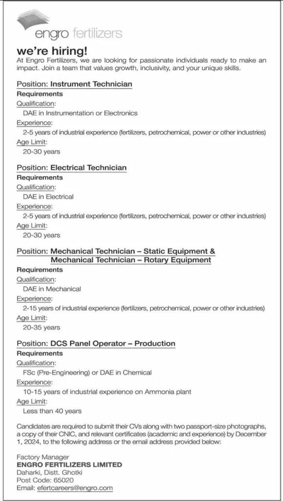 Engro Fertilizers Ghotki is offering DAE Jobs for skilled professionals to fill critical roles such as Instrument Technician, Electrical Technician, Mechanical Technician, and DCS Panel Operator. As a leading name in the industrial sector of Pakistan, Engro Fertilizers provides excellent career development opportunities. If you have the required qualifications and experience, this is your chance to join a prestigious private company in the fertilizers industry.