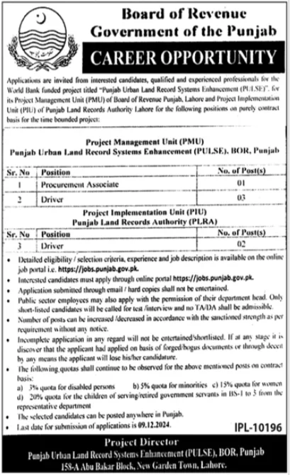 The Punjab Urban Land Systems Enhancement (PULSE) Project, managed by the Board of Revenue, Punjab, is offering exciting Driver Jobs in Lahore City. The project is seeking qualified individuals for roles such as Driver and Procurement Associate. These positions are open for candidates with educational qualifications ranging from Middle to Master’s degrees. Apply now to be part of a key initiative aimed at improving land management systems in Punjab.