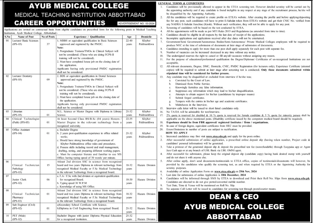 Ayub Medical College in Abbottabad is currently offering numerous medical job opportunities for the year 2024. With 73 vacant positions across various roles, the college invites qualified professionals to join their esteemed team. The available positions include Lecturers, Clinical Technicians, Junior Clerks, and Librarians. If you’re looking for a rewarding career in medical education or healthcare, these government jobs in Abbottabad provide competitive salaries and growth potential. Don’t miss the chance to apply before the deadline!