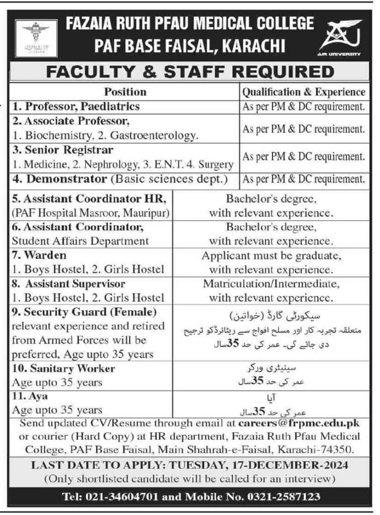 Apply before December 17, 2024 to secure your chance at these prestigious positions at Fazaia Medical College, Karachi!