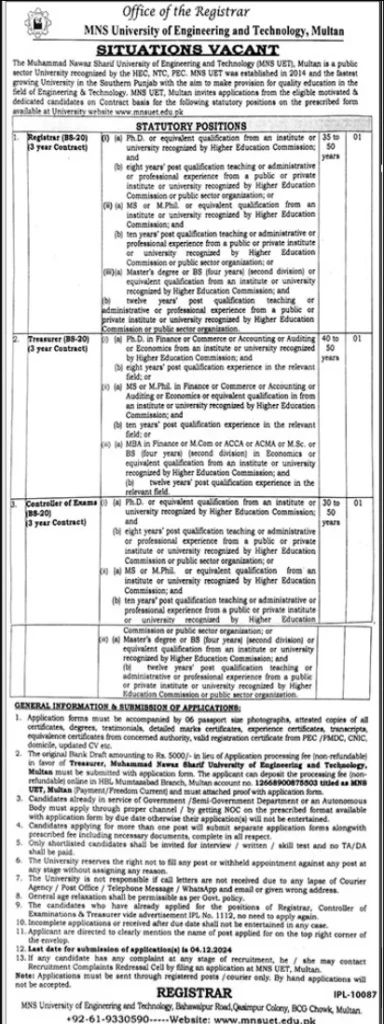 Muhammad Nawaz Sharif University of Engineering and Technology (MNS UET), a distinguished engineering institution recognized by HEC and PEC, has announced new statutory job positions. Qualified and experienced candidates are invited to apply for the positions of Controller of Examinations, Treasurer, and Registrar. This is a great opportunity for professionals to contribute to the academic and administrative excellence of a leading engineering university.