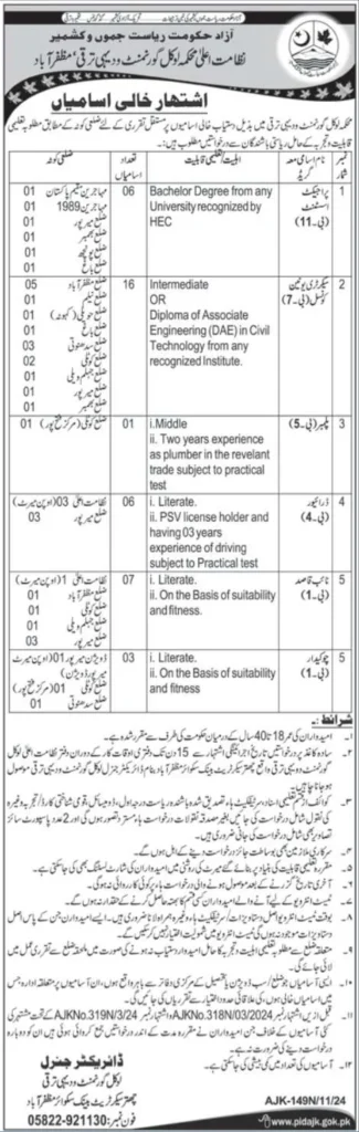 The Local Government Board Muzaffarabad has announced several vacancies in various positions for eligible candidates in Azad Jammu & Kashmir (AJK). The available positions include roles such as Junior Clerk, Sub Engineer, Plumber, Driver, Chowkidar, and Sanitary Worker. This recruitment is an excellent opportunity for those seeking to join the public sector and serve the community.