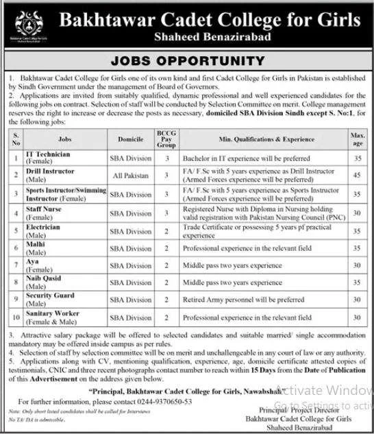 Govt Jobs in Nawabshah – Bakhtawar Cadet College Job Opportunities 2024